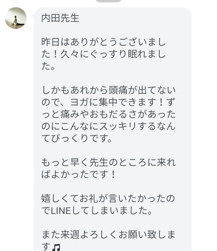 2回目位から頭痛がかなり減り、今ではほとんど出なくなりました。本当に先生のおかげです。